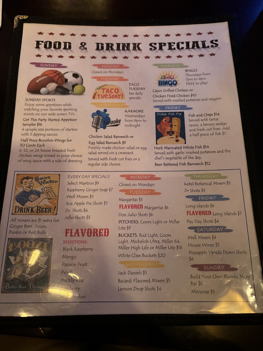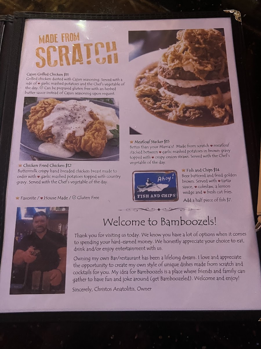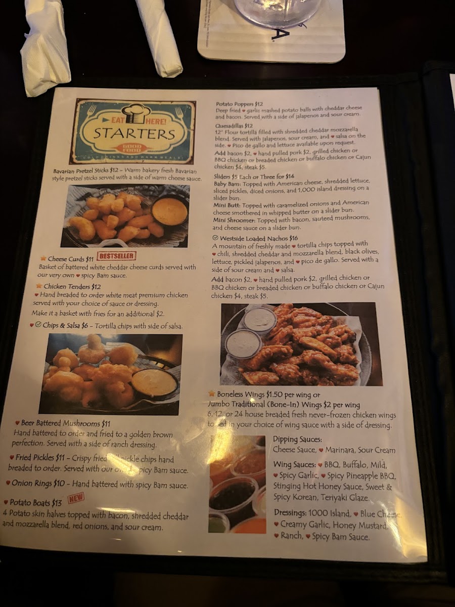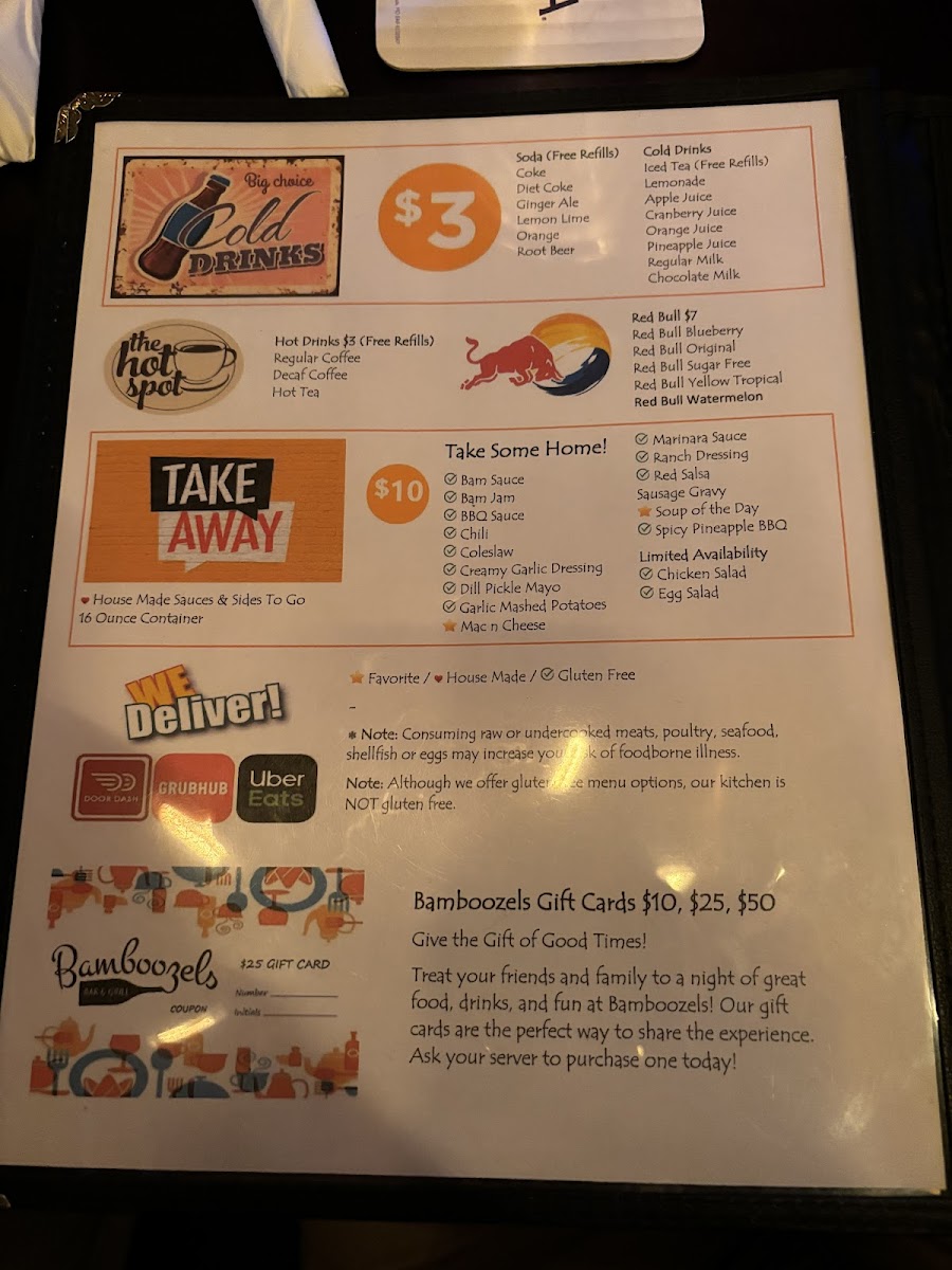 Welcome to Bamboozels, a hidden gem located at 101 W Main St, West Dundee, IL. This family-friendly eatery offers a delightful variety of dishes that cater to all cravings, from satisfying starters to hearty entrees. The menu shines with its crowd-pleasers like Chicken Tenders and Cheese Curds, perfectly paired with their signature Bam sauce. For fans of sandwiches, the Pulled Pork Bamwich is a must-try, nestled between a soft pretzel bun and lavishly topped with coleslaw and BBQ sauce.